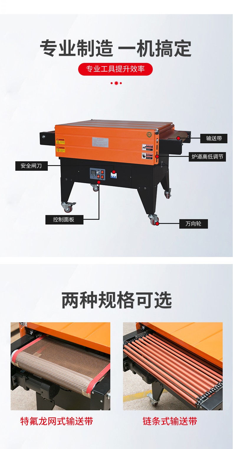 • 氣流覆蓋全面:噴氣式熱收縮機(jī)的噴氣裝置可以設(shè)計成多個噴氣嘴,能將熱氣流均勻地噴射到產(chǎn)品和熱收縮膜的各個部位。不像傳統(tǒng)熱收縮機(jī)可能存在加熱元件分布不均或熱傳遞死角的情況,導(dǎo)致薄膜收縮不均勻。比如在包裝形狀不規(guī)則的產(chǎn)品時,噴氣式熱收縮機(jī)能夠通過調(diào)整噴氣嘴的角度和氣流強(qiáng)度,使薄膜在產(chǎn)品的凹凸部位都能均勻收縮,而傳統(tǒng)熱收縮機(jī)可能會在產(chǎn)品的某些角落或凸起處出現(xiàn)薄膜皺褶或收縮不緊的現(xiàn)象2