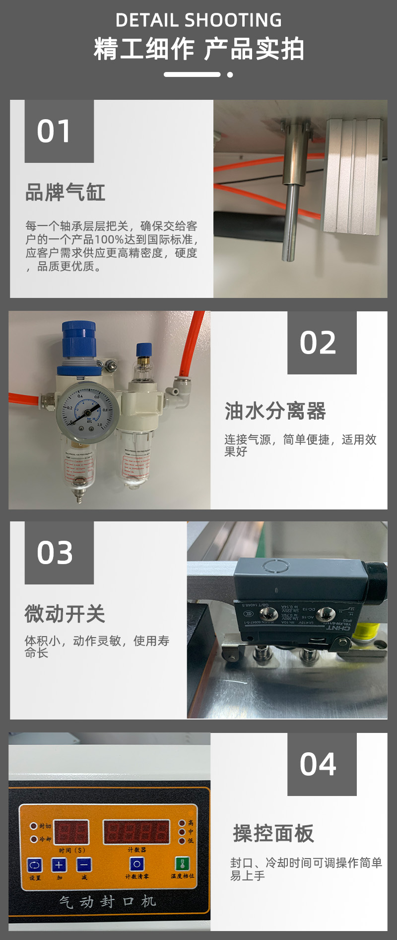 - 氣動系統(tǒng)的工作介質是空氣,空氣具有可壓縮性和流動性,這使得氣缸能夠快速響應控制信號。當需要進行封口操作時,氣動控制系統(tǒng)可以迅速將壓縮空氣輸送到氣缸,推動活塞運動,使封口壓頭快速下壓,實現(xiàn)對包裝袋的快速壓緊。相比之下,一些采用機械傳動或液壓傳動的封口機,由于機械結構的慣性、液壓油的流動特性等因素,在響應速度上可能會較慢。