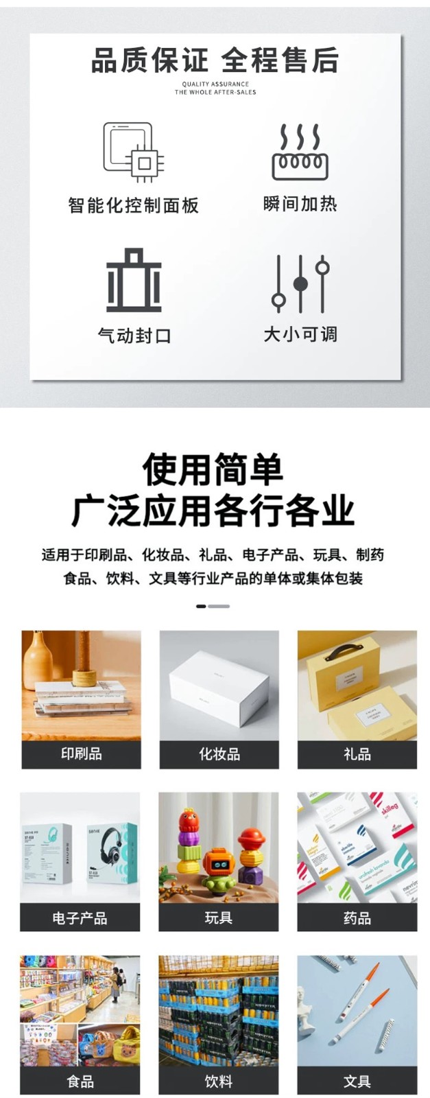 • 產(chǎn)品尺寸和形狀:產(chǎn)品的尺寸和形狀決定了設(shè)備的適用范圍。對(duì)于尺寸較大或形狀不規(guī)則的產(chǎn)品,需要選擇具有較大封口尺寸和靈活調(diào)整功能的設(shè)備,以確保能夠完全包裹和密封產(chǎn)品。
