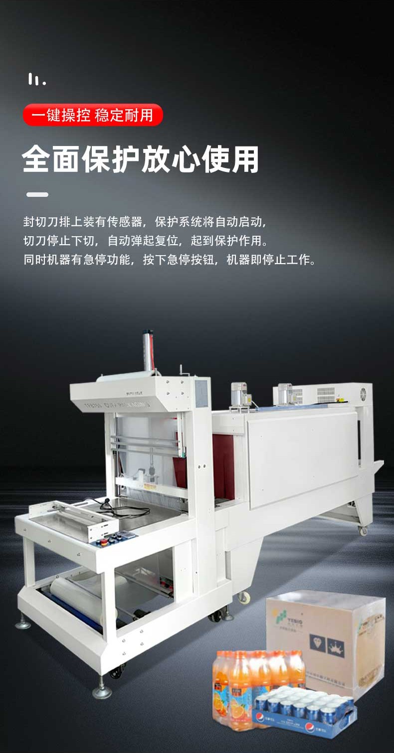 批量生產(chǎn)對設(shè)備的連續(xù)運(yùn)行能力要求極高,袖口式熱收縮包裝機(jī)通過三大設(shè)計確保穩(wěn)定性:其一,采用重型鋼結(jié)構(gòu)機(jī)身,搭配精密軸承與耐磨輸送帶,長期運(yùn)行后機(jī)身無明顯晃動,輸送帶磨損率降低 60%,使用壽命可達(dá) 3-5 年;其二,搭載進(jìn)口 PLC 控制系統(tǒng)與伺服電機(jī),核心部件故障率低于 0.3%,可支持 24 小時連續(xù)作業(yè),即使在食品飲料行業(yè) “旺季日產(chǎn) 10 萬瓶” 的高強(qiáng)度生產(chǎn)場景下,也能保持穩(wěn)定運(yùn)行;其三,配備完善的保護(hù)機(jī)制 —— 當(dāng)加熱管溫度異常、包裝膜斷膜、輸送帶卡瓶時,設(shè)備會自動切斷電源或暫停運(yùn)行,并在觸控屏上顯示故障原因,操作人員可快速排查維修,平均停機(jī)維修時間控制在 15 分鐘以內(nèi),大幅減少因設(shè)備故障導(dǎo)致的產(chǎn)能損失。