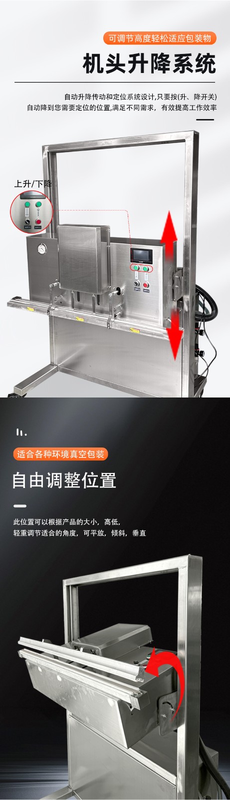 升降結(jié)構(gòu)適配不同高度:工作臺(tái)或封口部件可靈活升降,例如 鼎業(yè)1200型號(hào)的立式真空包裝機(jī),封口離地高度可調(diào)節(jié);立式升降系列機(jī)型頭部可垂直無論是小袋零食,還是 50kg 的大袋大米、塑膠料,都能找到適配的包裝高度。