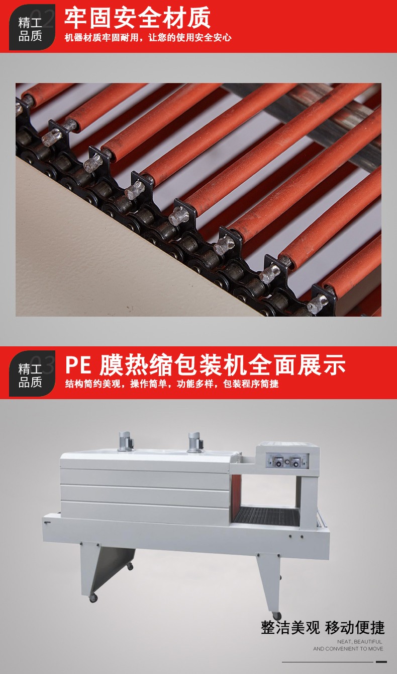 • 例如,當(dāng)把一個(gè)產(chǎn)品用 PE 薄膜包裹好,放入 PE 熱收縮機(jī)中,機(jī)器啟動(dòng)后,薄膜在熱的作用下,就像被賦予了 “生命力” 一樣,逐漸收縮,最后緊貼在產(chǎn)品的輪廓上,就像給產(chǎn)品穿上了一層定制的保護(hù) “外衣”。