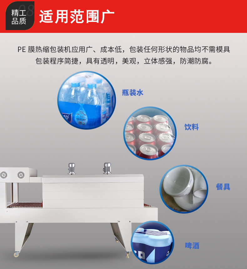 • PE 熱收縮機(jī)能夠使 PE 薄膜緊密地貼合在產(chǎn)品的各個(gè)部位,形成高質(zhì)量的包裝。這種緊密的包裝可以有效防止產(chǎn)品受到灰塵、水分、氧氣等外界因素的侵害。例如,在包裝食品時(shí),PE 薄膜可以阻止空氣和水分進(jìn)入,延長(zhǎng)食品的保質(zhì)期;在包裝電子產(chǎn)品時(shí),能防止靜電吸附灰塵,保護(hù)電子元件。