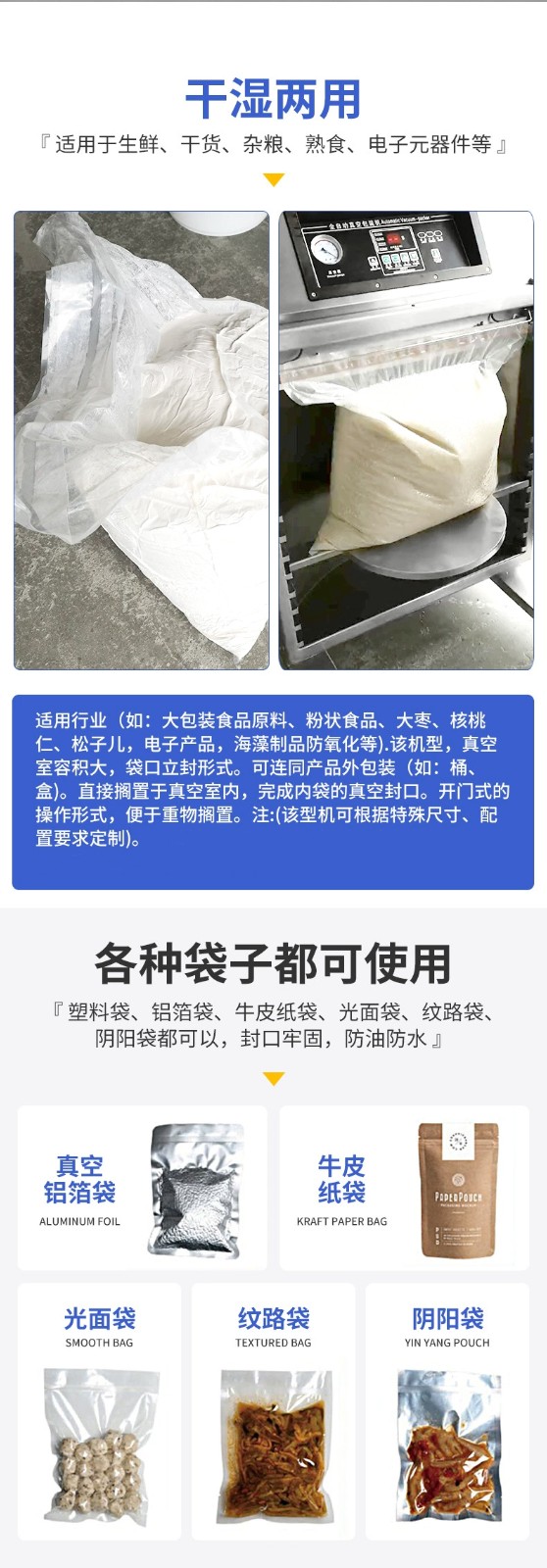 - 袋口立封形式:采用袋口立封的方式,可連同產(chǎn)品的外包裝,如桶、盒等,直接放置于真空室內,完成內袋的真空封口,使包裝成品更加美觀59。