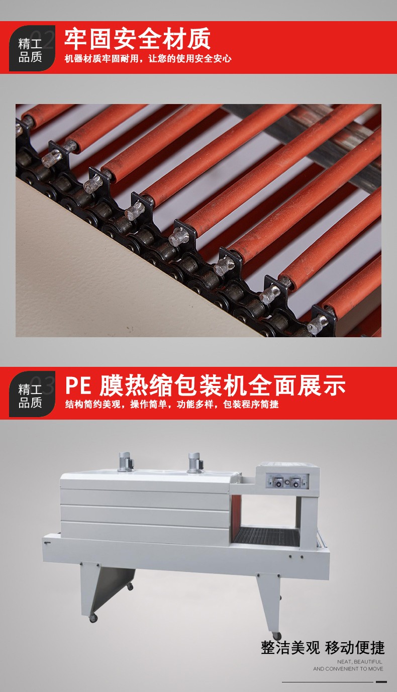 - 廣泛的產(chǎn)品適用性:能夠適應(yīng)各種形狀、大小和材質(zhì)的產(chǎn)品包裝。無論是小型的文具、首飾,還是大型的家具、工業(yè)設(shè)備等,都可以使用 PE 熱收縮包裝機進行包裝。對于不同尺寸的產(chǎn)品,只需調(diào)整輸送帶的速度和加熱時間等參數(shù)即可。同時,它也可以與多種包裝材料兼容,只要是 PE 薄膜,無論其厚度、韌性等特性如何,都能通過適當?shù)膮?shù)調(diào)整實現(xiàn)良好的包裝效果。