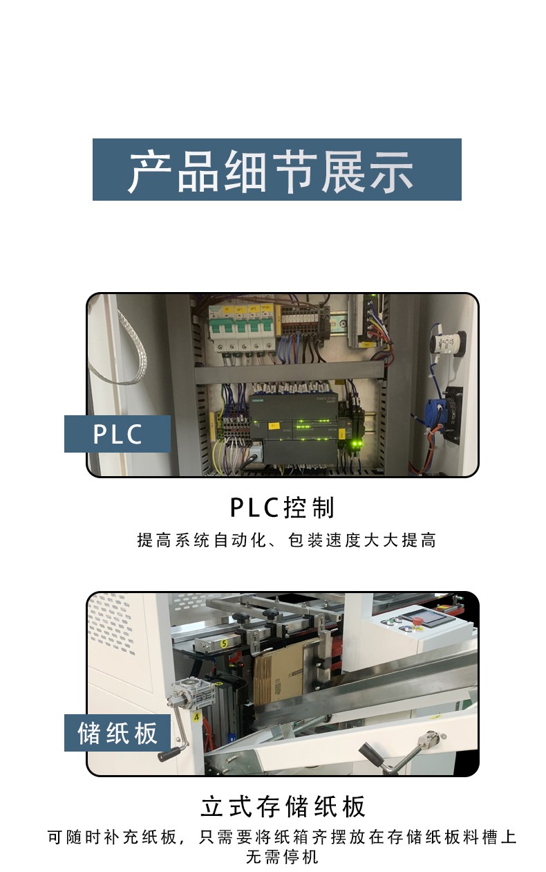 設(shè)備通過 PLC 程序精準(zhǔn)控制每一步動(dòng)作(如吸箱力度、折邊角度、膠帶粘貼壓力),確保所有紙箱的