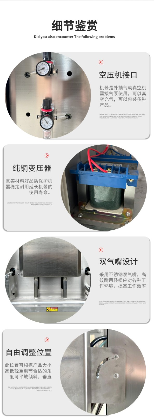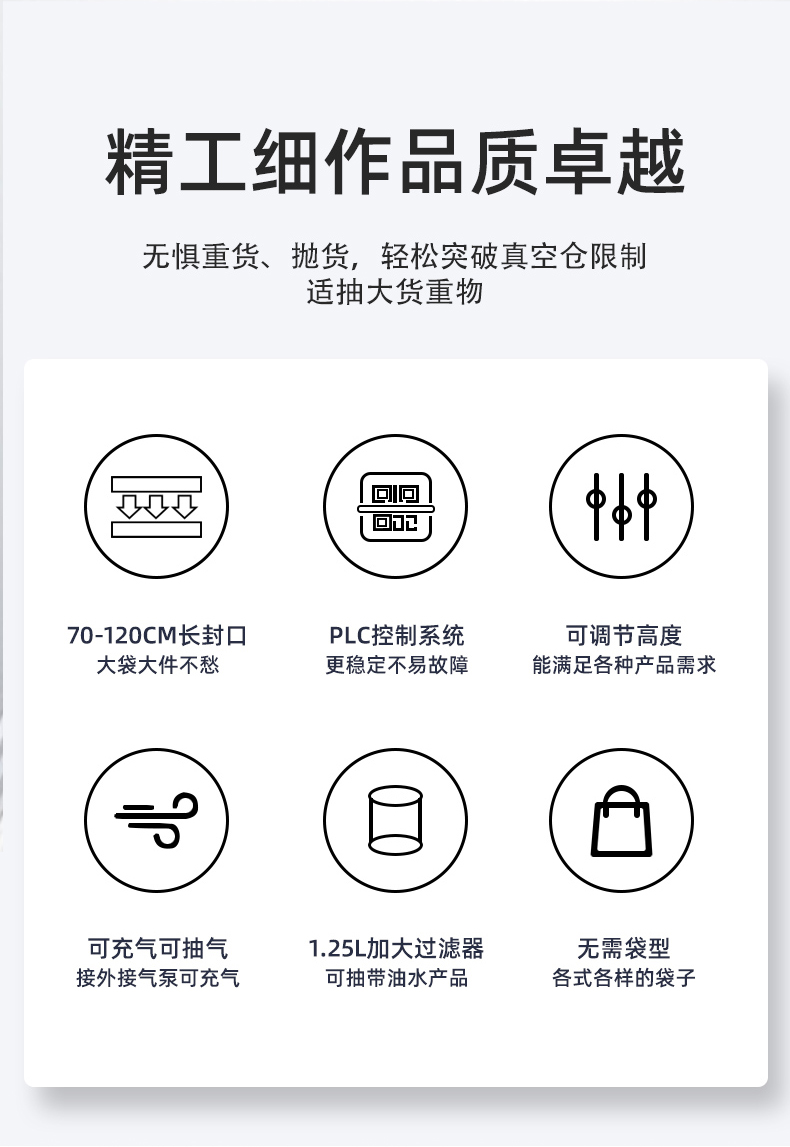 可定制與多模式適配不同尺寸:部分機(jī)型支持封口規(guī)格定制,封口長度可達(dá)到 800mm、1000mm 甚至 1200mm 等,適配不同寬度的包裝袋。同時(shí),部分先進(jìn)機(jī)型預(yù)設(shè)多組工作模式,可快速切換真空、充氣、封口等流程,適配從小袋糕點(diǎn)到大袋五金模具等不同尺寸、類型產(chǎn)品的包裝需求。