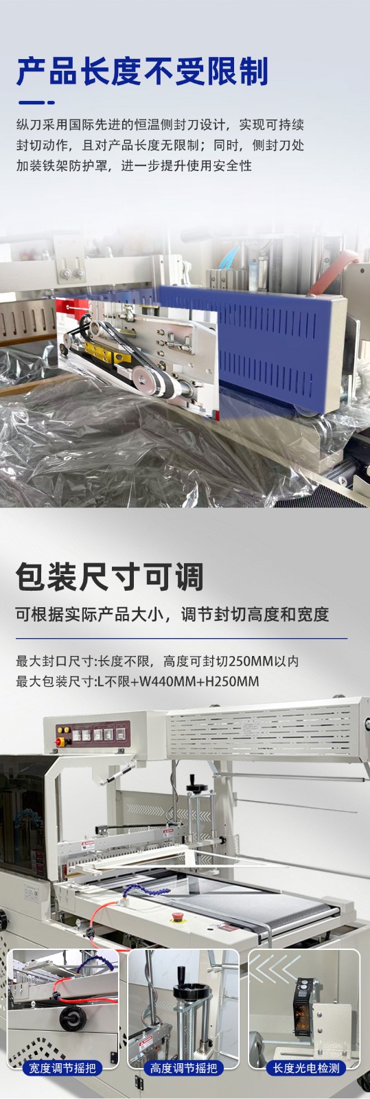 邊封機(jī)采用對(duì)折薄膜裹包產(chǎn)品的方式,形成環(huán)繞產(chǎn)品的薄膜 “套管”,僅對(duì)產(chǎn)品的側(cè)邊和尾部進(jìn)行封切。其中尾部封切是隨著產(chǎn)品連續(xù)輸送,由橫封刀實(shí)時(shí)下落完成相鄰產(chǎn)品的分隔封口,無需受設(shè)備框架尺寸制約。再加上水平和垂直兩組光電傳感器自動(dòng)偵測(cè)產(chǎn)品長(zhǎng)度,不管是短至幾厘米的小物件,還是長(zhǎng)至數(shù)米的鋁型材、木地板等,都能順暢完成包裝,不用更換適配不同長(zhǎng)度的部件。