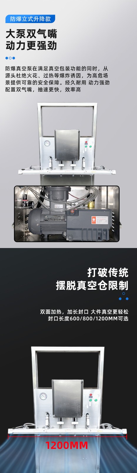 立式防爆真空包裝機的防爆配置集中在電氣、動力及密封過濾等關(guān)鍵部件,以此適配易燃易爆的特殊工況