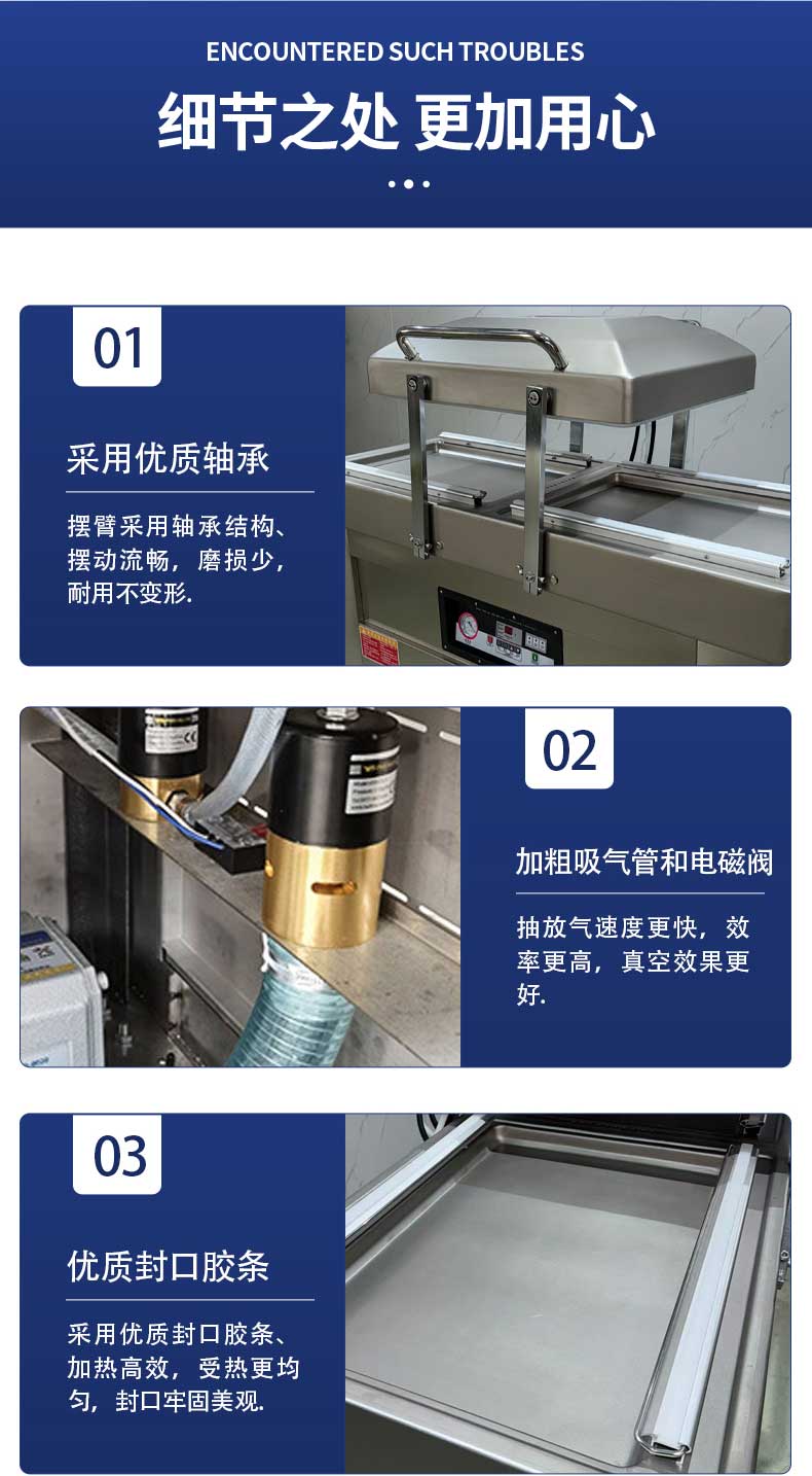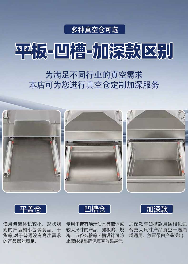 設(shè)備核心創(chuàng)新在于真空室的凹槽式設(shè)計,真空室內(nèi)腔下凹深度可達10-40厘米(支持定制),鹵味拼盤、整只帶湯燒雞、大份預(yù)制菜等產(chǎn)品可垂直或傾斜放置,袋內(nèi)湯汁自然匯聚于凹槽底部,與封口線形成安全距離。配合“液體防吸智能程序”,設(shè)備采用“先微壓排氣再深度抽真空”的梯度模式,緩慢排出袋內(nèi)空氣的同時避免湯汁飛濺,解決了傳統(tǒng)設(shè)備抽真空時“噴液進泵”的維修難題。