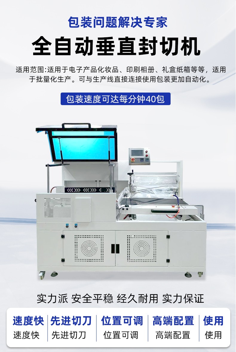 適合規(guī)則 / 不規(guī)則盒裝、瓶裝、禮盒裝產(chǎn)品(如食品禮盒、醫(yī)藥盒、日化套裝),尤其適配批量≥300 件 / 小時(shí)的生產(chǎn)線,相比 L 型封切機(jī)更適合易折皺、需精準(zhǔn)封口的產(chǎn)品。