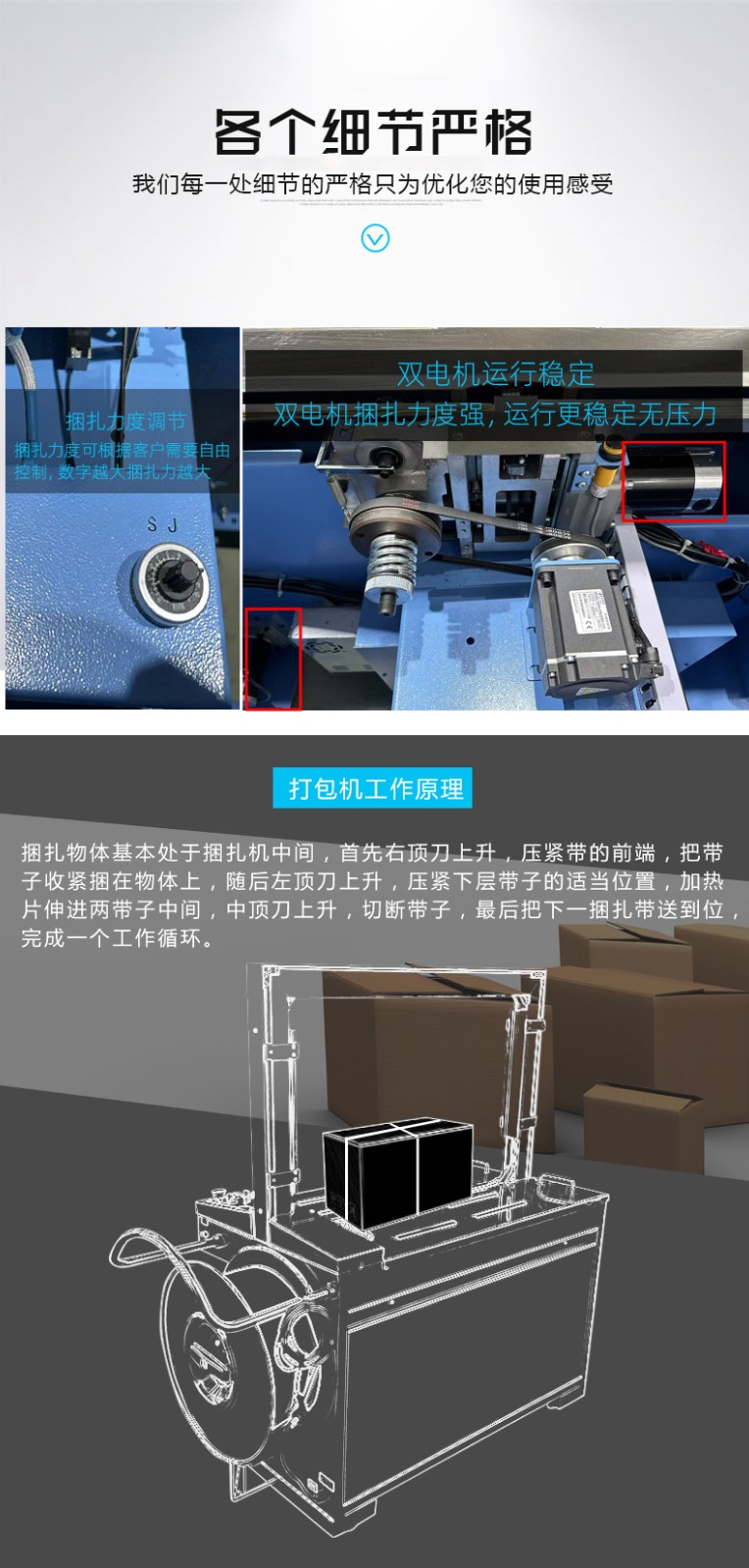 伺服電機作為核心部件,相比傳統(tǒng)電機,能實現(xiàn)更高的控制精度和響應(yīng)速度,可在捆扎時精準(zhǔn)調(diào)整捆扎帶張力,保障捆扎的緊密與均勻。
