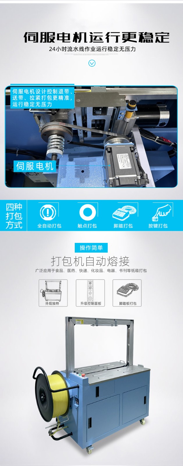 搭載高性能伺服電機驅(qū)動系統(tǒng),設(shè)備運行過程中動力輸出平穩(wěn)無頓挫,啟停響應(yīng)速度快且動作銜接精準(zhǔn)流暢,從送帶、收緊、熔接到切帶復(fù)位的每一個包裝環(huán)節(jié),都能按照預(yù)設(shè)參數(shù)精準(zhǔn)執(zhí)行。相較于傳統(tǒng)異步電機,伺服電機可通過實時閉環(huán)控制,精準(zhǔn)調(diào)節(jié)運行速度與扭矩,在捆扎收緊階段,能根據(jù)貨物規(guī)格自動適配張力大小,避免因張力過大導(dǎo)致包裝帶斷裂、貨物變形,或張力不足造成的捆扎松散問題,有效降低包裝過程中的位置誤差、力度誤差與時間誤差。同時,伺服系統(tǒng)的高重復(fù)性定位精度,可保證每一件產(chǎn)品的包裝效果高度統(tǒng)一,無論是包裝帶的位置偏移量,還是熔接處的平整程度,都能控制在極小的誤差范圍內(nèi),讓成品包裝外觀整齊劃一,大幅提升產(chǎn)品包裝的整體一致性與視覺美觀度。廣泛應(yīng)用于,食品行業(yè)、醫(yī)藥行業(yè)、化工行業(yè)、其他行業(yè)等