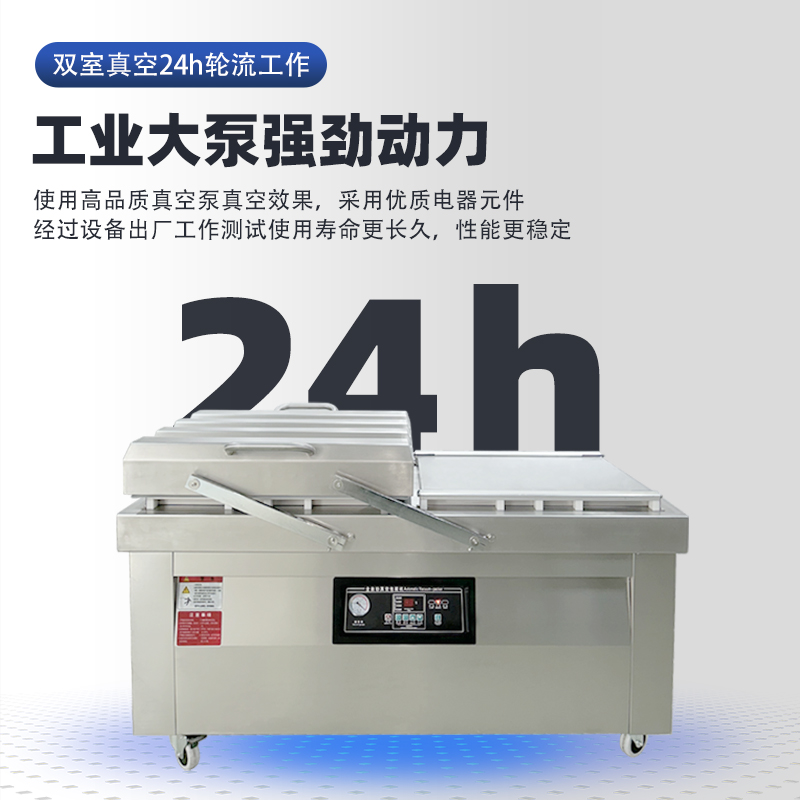 雙室機(jī)型的兩個真空室可實(shí)現(xiàn) “一工一備”:當(dāng)其中一個真空室正在進(jìn)行抽真空、熱封作業(yè)時,操作人員可以在另一個真空室完成物料擺放、袋口整理的準(zhǔn)備工作。