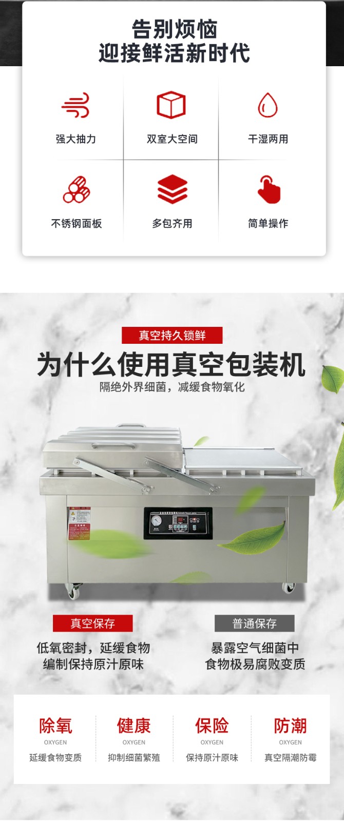 雙室平板真空包裝機(jī)對比單室真空包裝機(jī),核心優(yōu)勢集中在作業(yè)效率、生產(chǎn)連續(xù)性、人工利用率