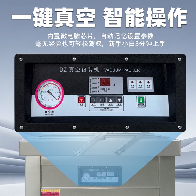- 抽真空:壓下機蓋,面板上抽氣(真空)指示燈亮,真空泵開始抽氣,可通過抽真空旋鈕根據(jù)包裝要求調(diào)節(jié)真空度高低。