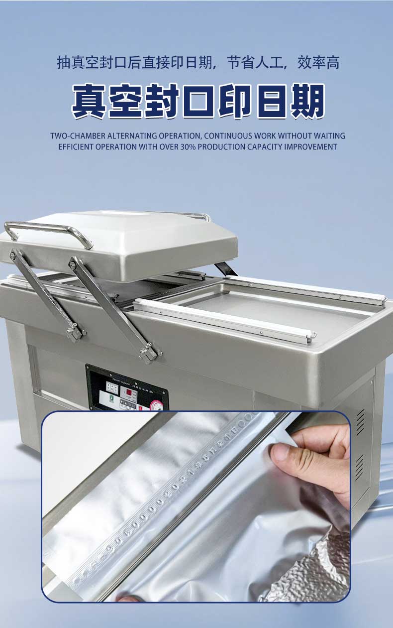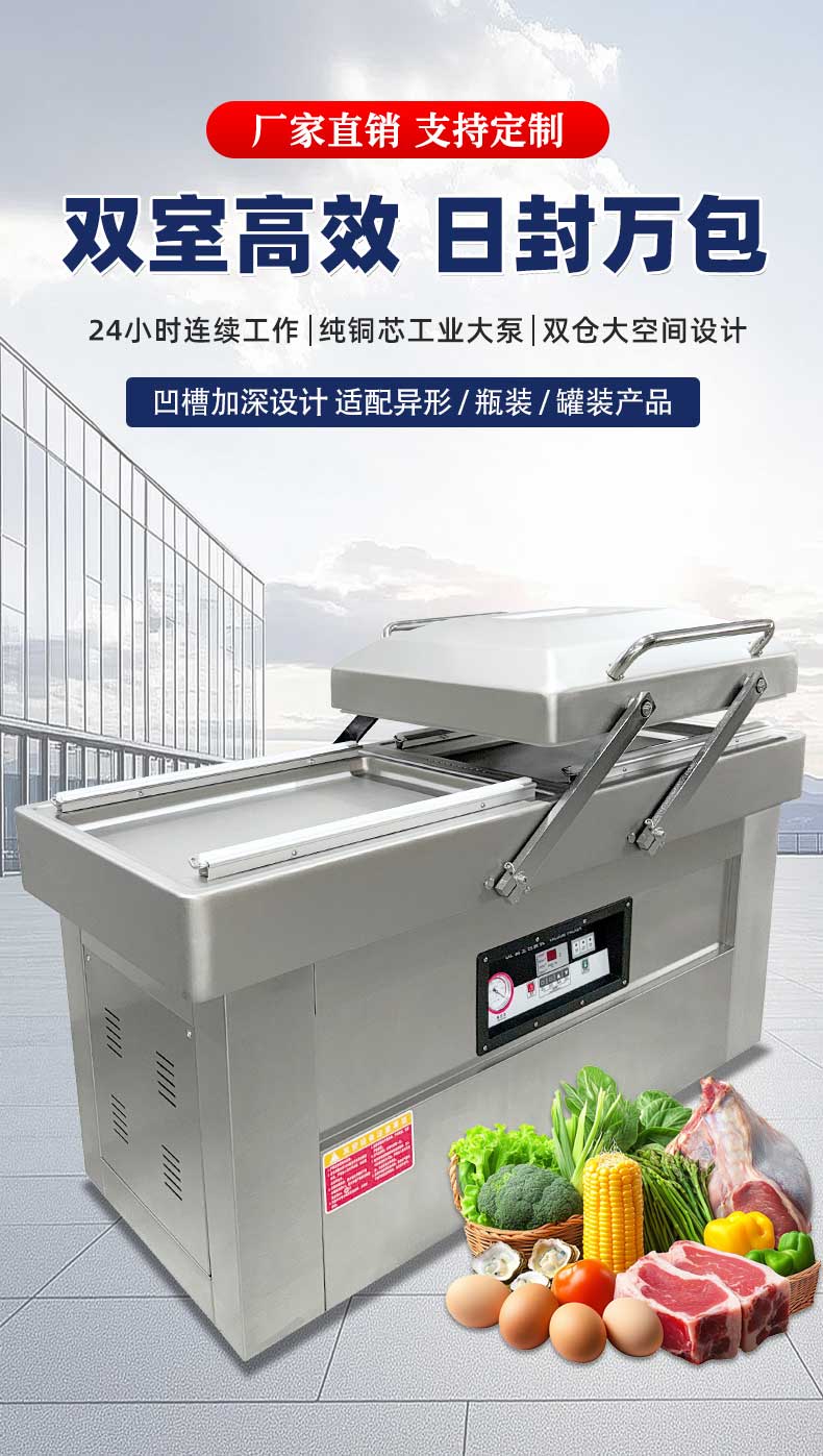 雙室真空包裝機可在真空包裝的基礎(chǔ)上,向包裝袋內(nèi)充入氮氣、二氧化碳等惰性氣體或混合氣體,起到更好的防腐、防潮、防氧化等保質(zhì)效果