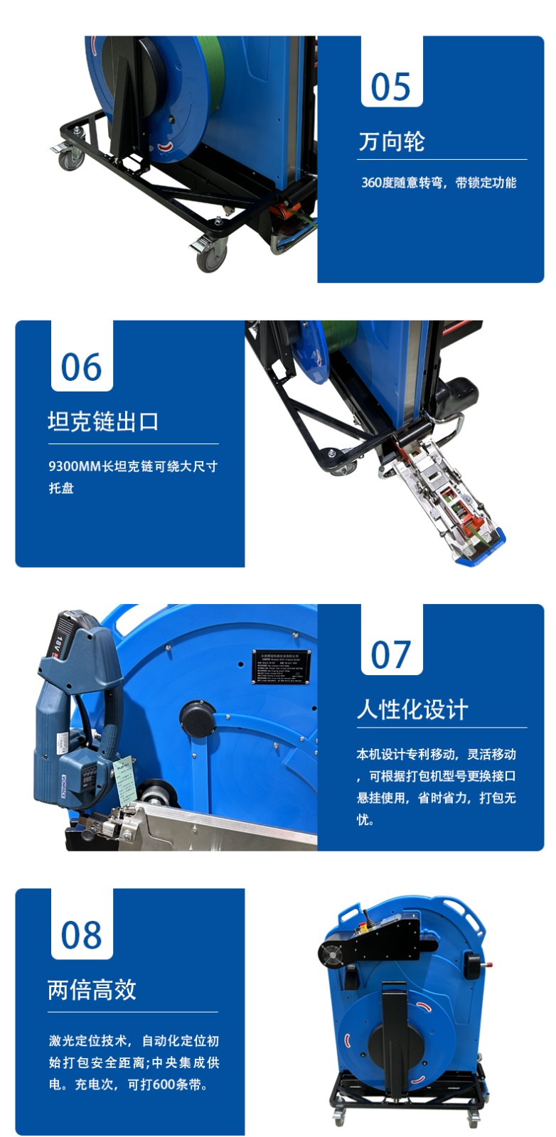 - 導(dǎo)向系統(tǒng):由多個(gè)導(dǎo)向輪和導(dǎo)軌組成。導(dǎo)向輪一般是可以靈活轉(zhuǎn)動(dòng)的滾輪,它們可以根據(jù)打包帶的寬度和穿帶路徑進(jìn)行調(diào)整。導(dǎo)軌則是為打包帶提供了一個(gè)固定的通道,確保打包帶沿著預(yù)定的路線行進(jìn)。比如,當(dāng)打包帶需要轉(zhuǎn)彎時(shí),導(dǎo)向輪會(huì)將其引導(dǎo)到合適的軌道上。