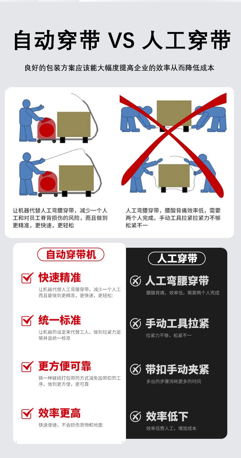 - 提高準(zhǔn)確性:穿帶機(jī)能夠按照精確的路徑和位置進(jìn)行穿帶,減少了人工穿帶可能出現(xiàn)的打包帶位置偏差。這對(duì)于需要高質(zhì)量包裝的產(chǎn)品,如精密儀器、電子產(chǎn)品等,非常重要,可以有效防止產(chǎn)品在運(yùn)輸過(guò)程中因打包帶位置不當(dāng)而受到損壞。