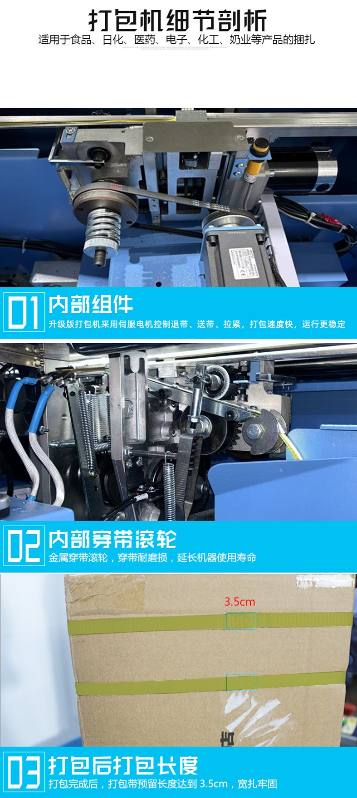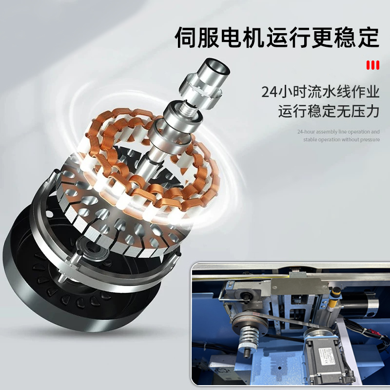 • 捆扎打包:根據(jù)預(yù)設(shè)的參數(shù),伺服電機(jī)驅(qū)動(dòng)打包帶圍繞物品進(jìn)行捆扎。在捆扎過程中,伺服電機(jī)精確控制打包帶的張力,確保打包帶能夠緊密地貼合在物品表面,同時(shí)又不會(huì)對(duì)物品造成損壞。完成捆扎后,切斷機(jī)構(gòu)會(huì)自動(dòng)將打包帶切斷,并對(duì)末端進(jìn)行熱封或其他方式的處理,防止打包帶松開。