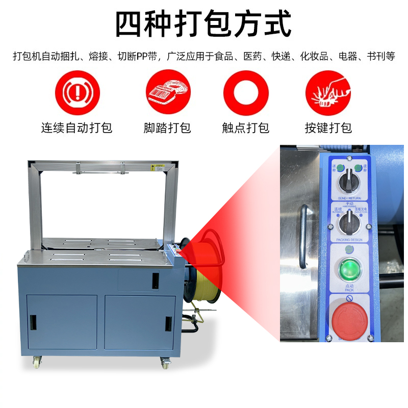 • 自動(dòng)上帶:機(jī)器啟動(dòng)后,會(huì)自動(dòng)從打包帶卷中抽出打包帶,并將其傳送到預(yù)定的位置,準(zhǔn)備進(jìn)行打包。這個(gè)過程無需人工干預(yù),大大提高了工作效率。