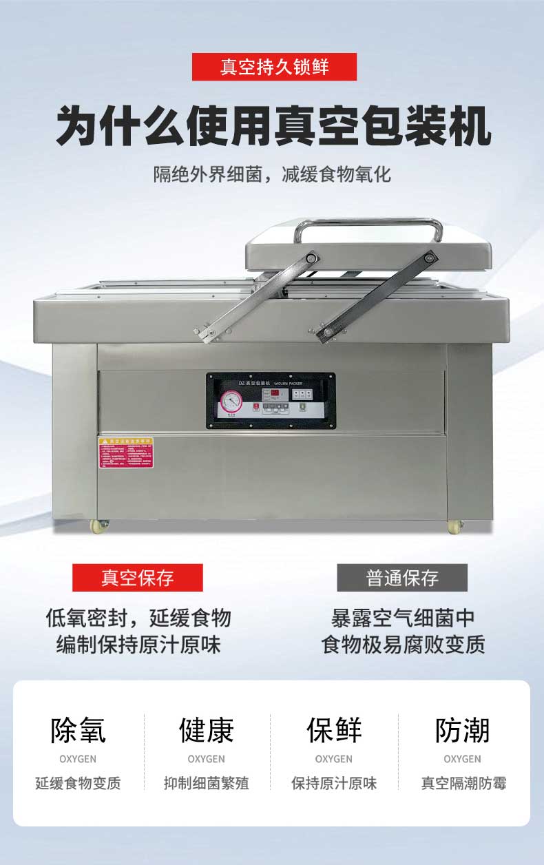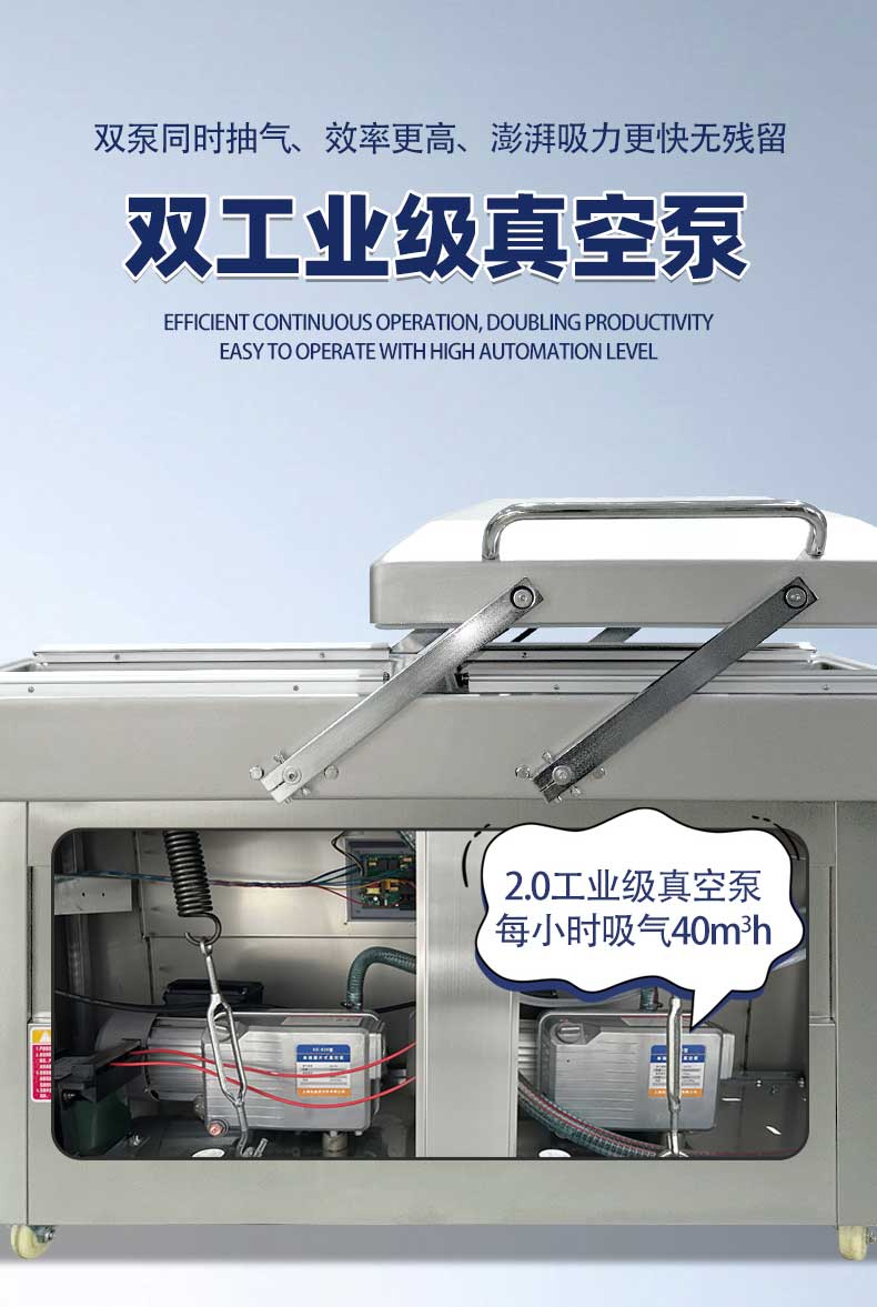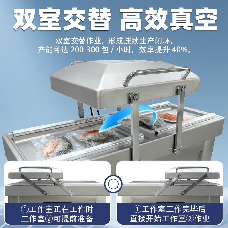 - 雙室設(shè)計:一個真空室在抽真空時,另一個真空室可以擺放包裝物,交替工作,節(jié)省操作時間,提高包裝效率。