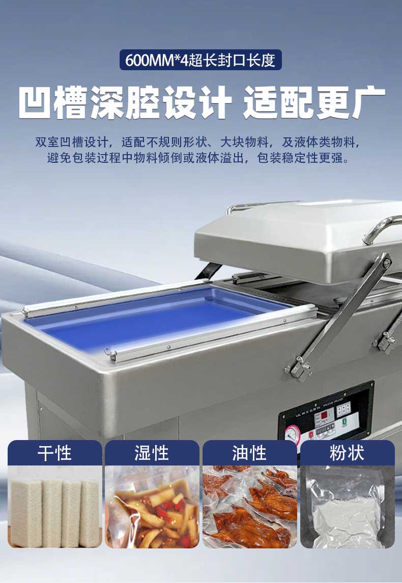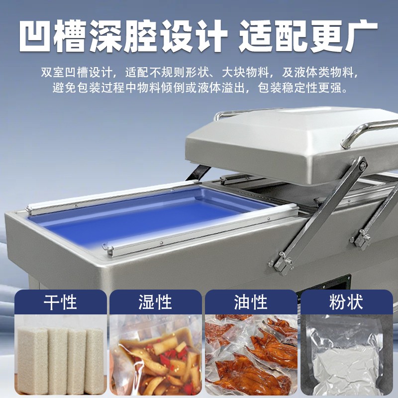 雙室凹槽真空包裝機,專為鹵味、水產(chǎn)、預(yù)制菜等帶湯汁、高水分產(chǎn)品量身打造,創(chuàng)新下凹式真空室結(jié)構(gòu)搭配雙室交替工作模式,既解決液體包裝溢漏難題,又大幅提升生產(chǎn)效率,是食品加工、生鮮鎖鮮的得力設(shè)備。